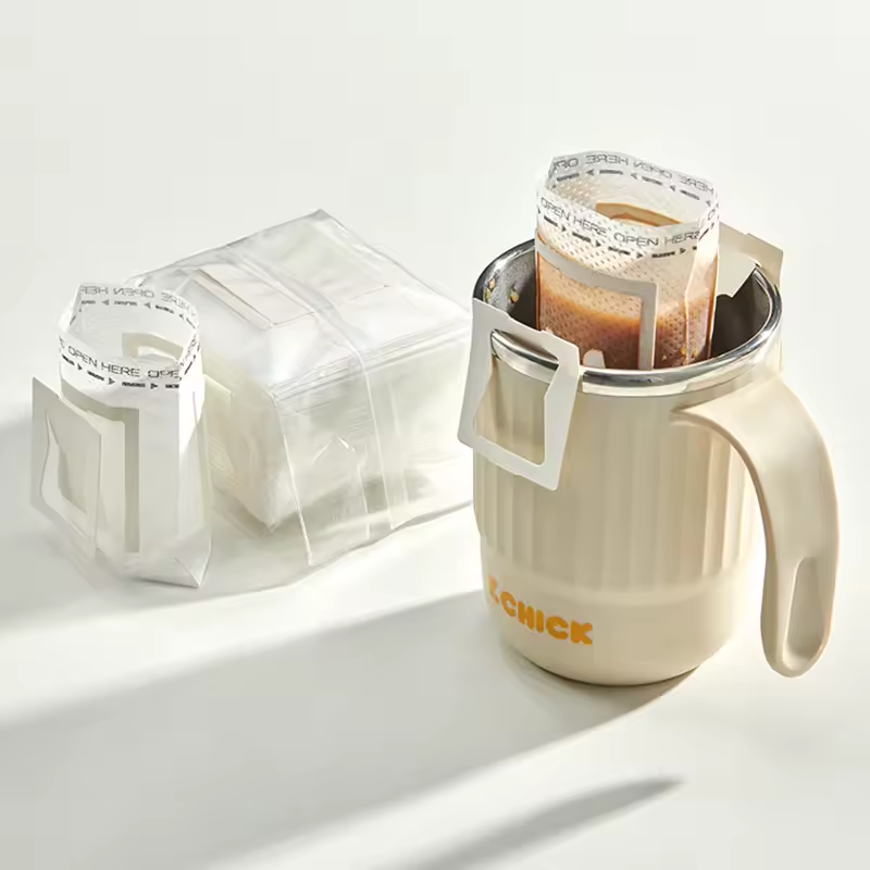Ideales para viajes, camping u oficina, estas bolsas filtro desechables permiten preparar café por goteo de forma práctica. Están hechas principalmente de tela no tejida y unidas mediante tecnología ultrasónica (sin adhesivo). Solo agregas café molido, cuelgas la bolsa en la taza y viertes agua caliente