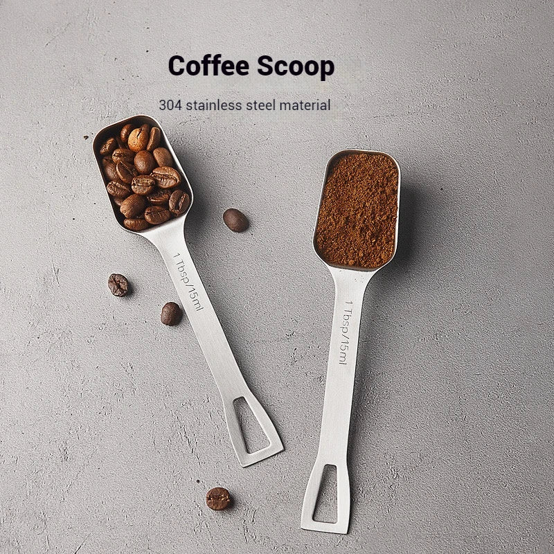 Cuchara medidora de café fabricada en acero inoxidable 304, ideal para dosificar café en grano o café molido en el uso diario. Cuenta con un acabado tipo cepillado, pensado para entregar buena resistencia a